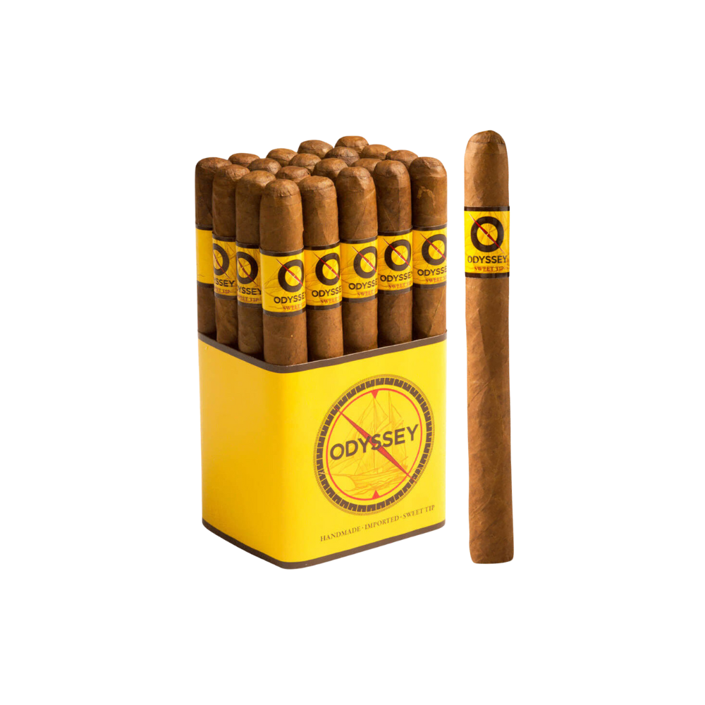 The Odyssey Sweet Tip Churchill is a cigar that features a delicious Cuban-style sweetened tip and a solid blend recipe of Honduran and Nicaraguan long-fillers, sturdy Nicaraguan binder, and oily Habano wrapper . It is described as a mellower side of medium bodied and on the mouth-watering side of full in creamy taste, making it a perfect cigar for a daily dose of handmade cigar enjoyment.